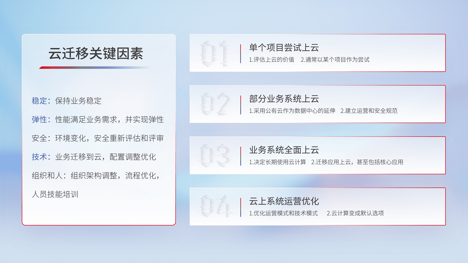 结合实际业务,,从规划设计、、云平台选型、、、、云原生改造、、数据迁移、、、、集成交付,,,迁移全过程为客户识别最佳上云路径,,做好风险识别管理,,设计网络架构、、身份权限、、、安全审计合规、、操作审计、、、日志审计、、监控告警策略、、、多站点容灾设计等,,对云上基础设施进行整体规划,,,提升IT治理水平,,,,以满足弹性、、高可用、、高性能的需求。。。。
