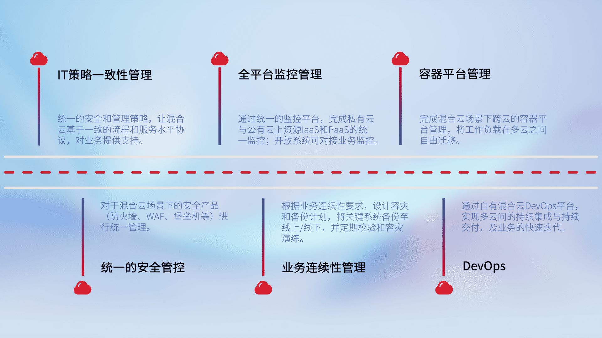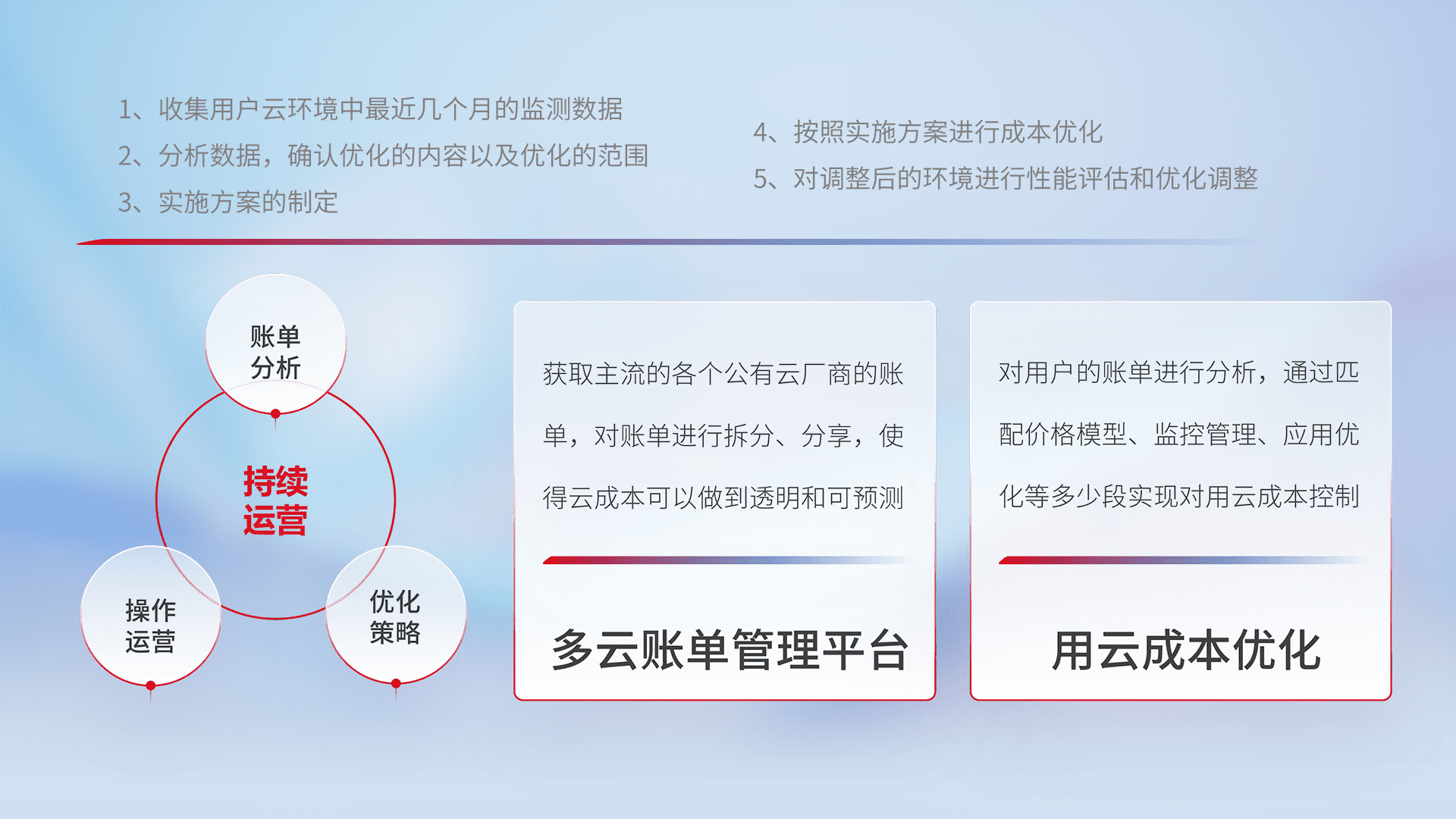 通过多云纳管,,,,以统一的资源数据模型把客户的云资源进行抽象和封装,,进而实现对多云资源的统一操作,,保障云资源管理的可靠性、、稳定性与可用性。。。。量身定制化运维内容,,配置、、开发运维、、、、补丁管理、、、、备份、、、、监控、、、、认证和访问管理、、、审计和日常巡检等,,,保障在用云过程中的可靠度,,,稳定度以及高可用率。。